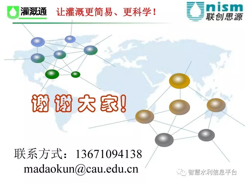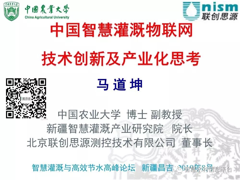 归档时间:2019-09-18以“发展智慧灌溉·共建节水社会”为主题的2019智慧灌溉与高效节水高峰论坛·新疆站于2019年8月27-30日在新疆昌吉隆重召开。 中国水利企业协会智慧水利分会副会长、中国农业大学教授、新疆智慧灌溉产业研究院院长马道坤 作了题为“中国智慧灌溉技术创新及产业化思考”的报告。现将马道坤教授的PPT与大家分享。