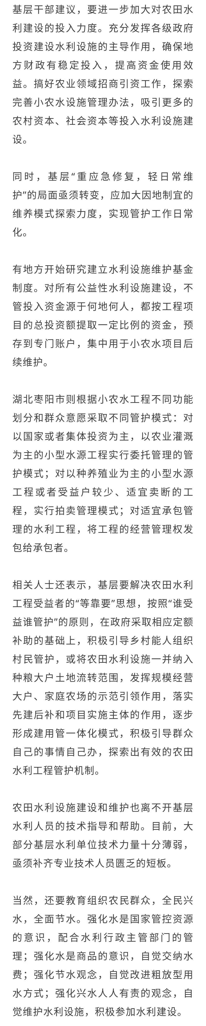 田间工程配套水平不高,管护难。新一轮机构改革后,小型农田水利建设管理职责已整合至农业农村部门,但从全国层面来看,“重建轻管”的突出问题没有太大改观。农田水利工程建成后,往往交给乡镇、村集体甚至个人去管护,没有明确的管护责任,也没有稳定的维护费用。“如果管不好,水利工程有等于无。一条管道出了毛病,常常整个水利系统都不能用了。”刘经强说。