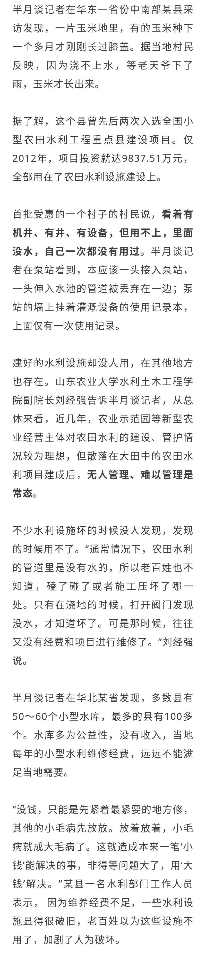 比如,一些小的设计院,没有专业知识,不管地下有水没水,都先设计上地下取水孔。有的打开机井就没水,有的运气好,有一点水,但根本不能满足用水需求。有的泵站蓄水池过浅,有的小农水项目管道过粗,还有的水利设施建好后没有通电……这样的农田水利工程,必然不能发挥应有的作用。