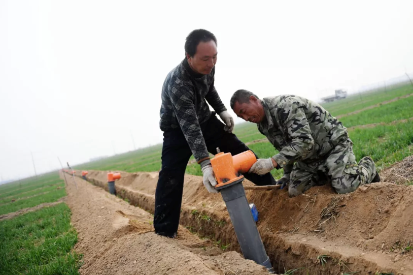 农民在田间安装水利设施