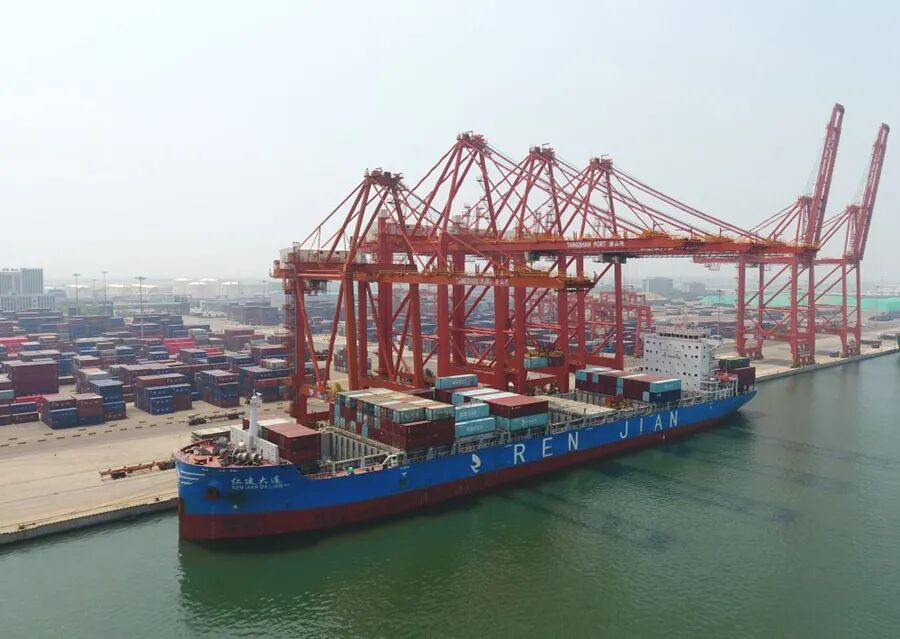 7月16日,一艘轮船靠泊在唐山港京唐港区集装箱码头装货。