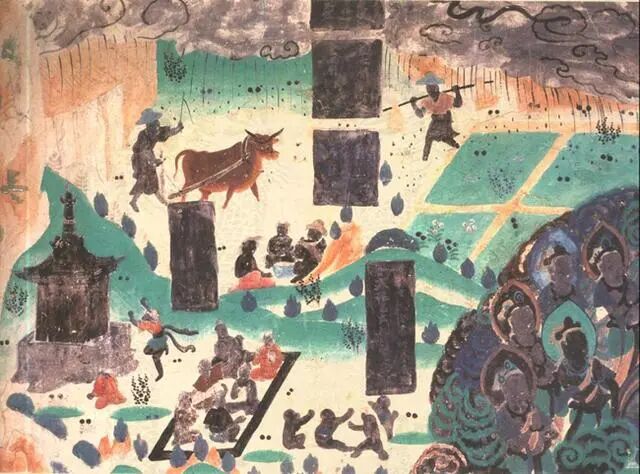 盛唐时期,莫高窟23 窟中的雨中耕作图。图片来源:《敦煌石窟全集》
