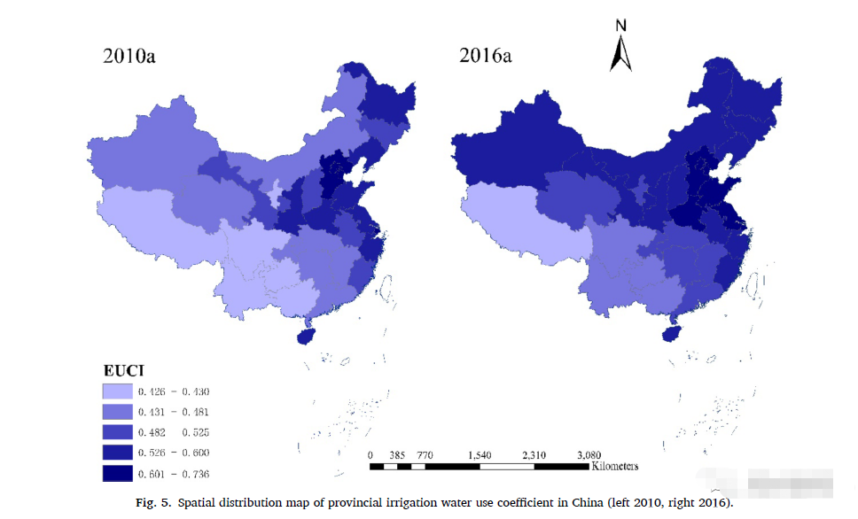 同时沿海地区的系数也高于内陆地区。2016年,西北诸河、黄河、松花江、辽河地区灌溉用水系数由0.430以下显著提高到0.525.4以上,华北地区灌溉用水系数比西南地区高37.833%。灌溉用水系数的空间发布与经济水平、作物种植条件、气候环境、地形和水资源禀赋等多种条件相关。